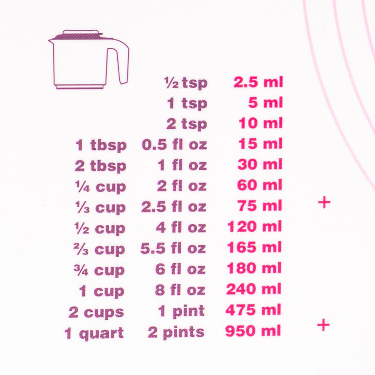 • Tabuľky prepočtu – umožňujú ľahké prepočítavanie medzinárodných receptov priamo na podložke.